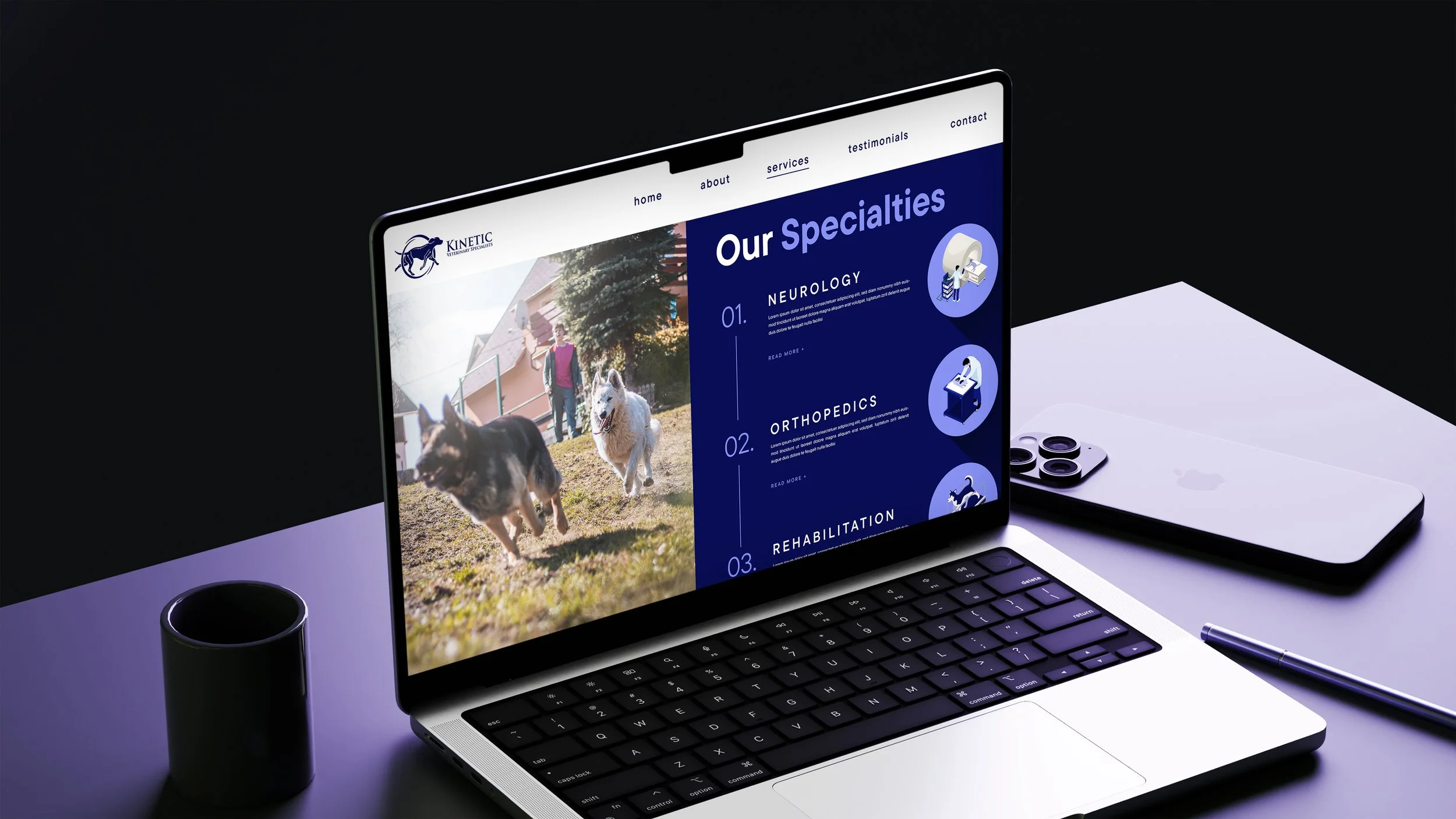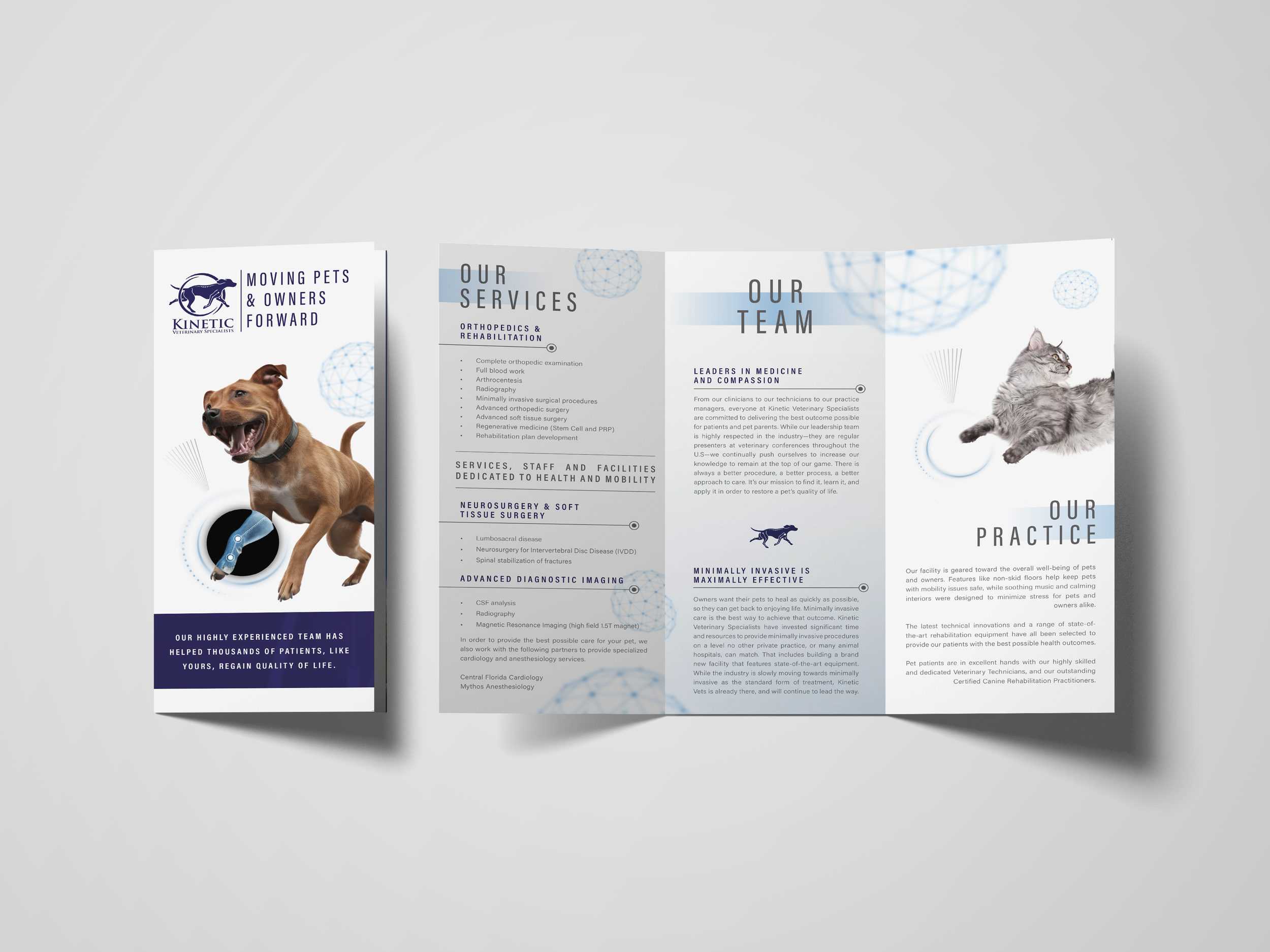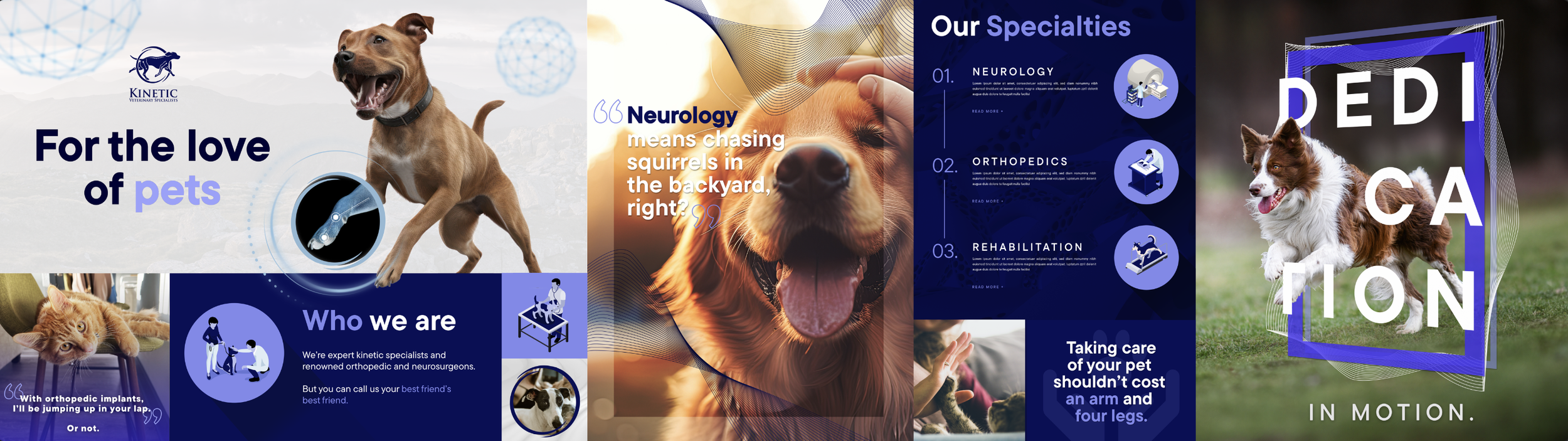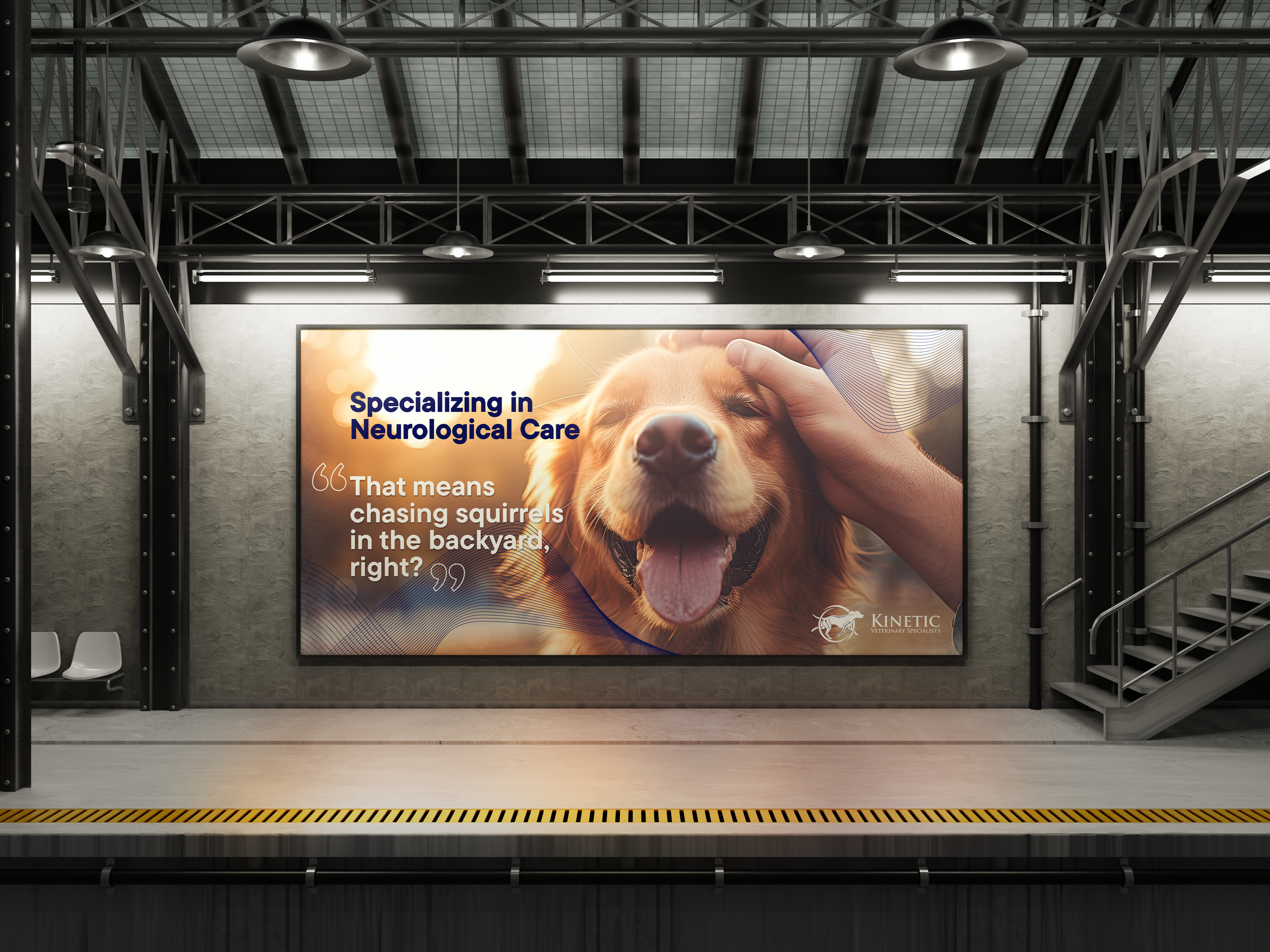 Kinetic Vets needed a branding concept that balanced the needs of two key audiences: peers in specialty veterinary care and concerned pet parents seeking expert treatment. To meet both needs, we developed a concept that speaks to fellow professionals through subtle references to science and motion, while expressing warmth, compassion, and personality to reassure clients that their pets are in capable hands.
