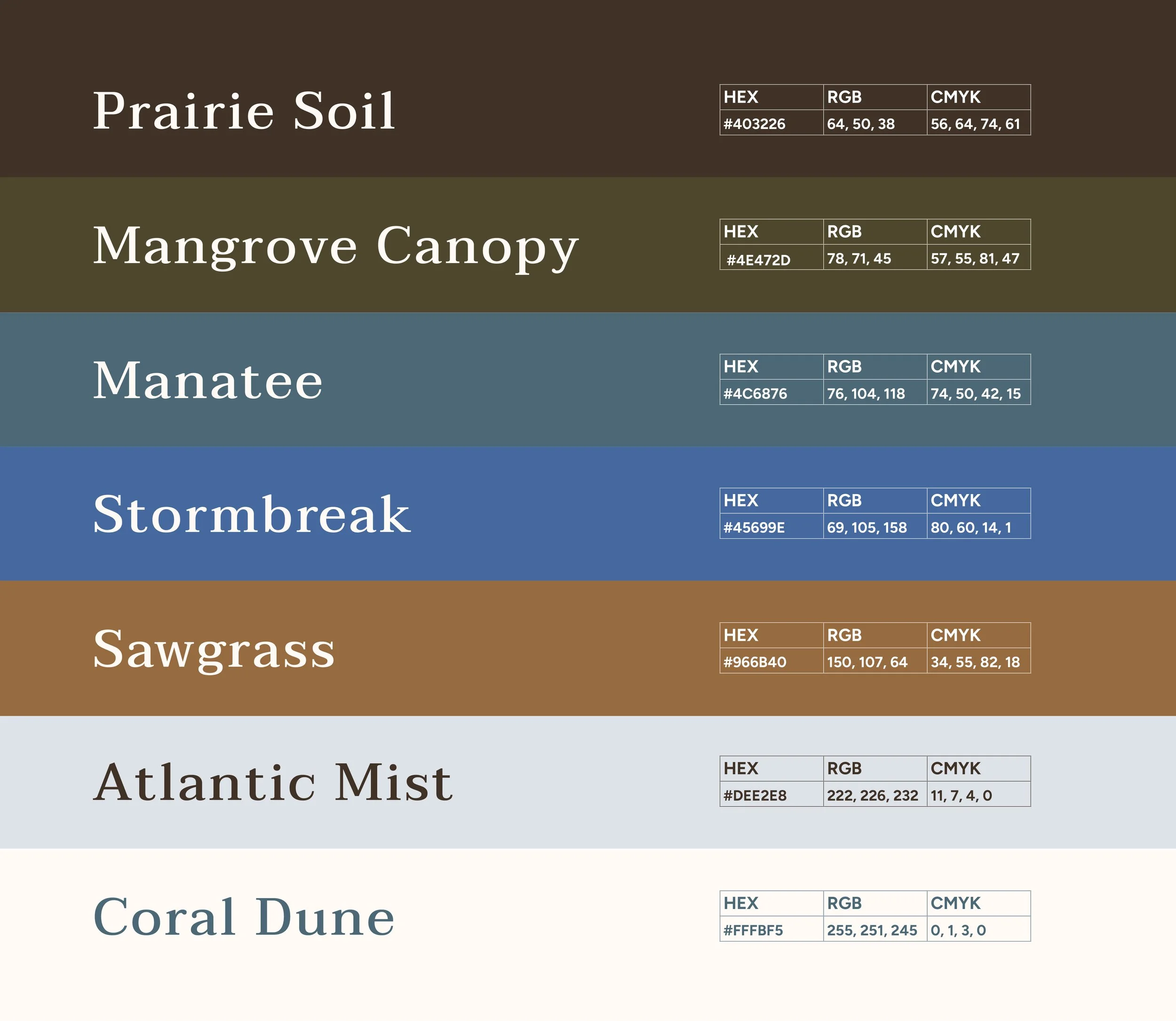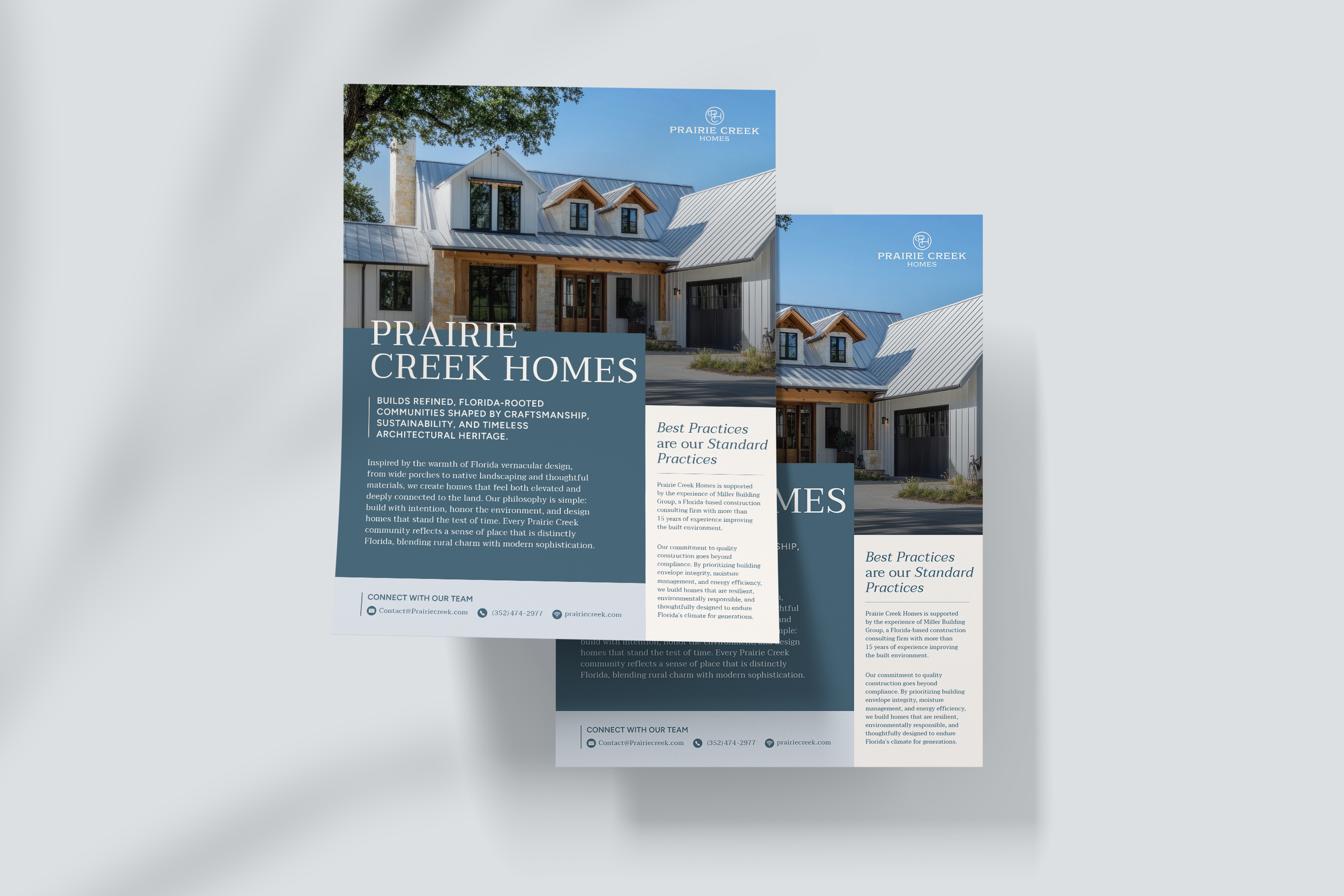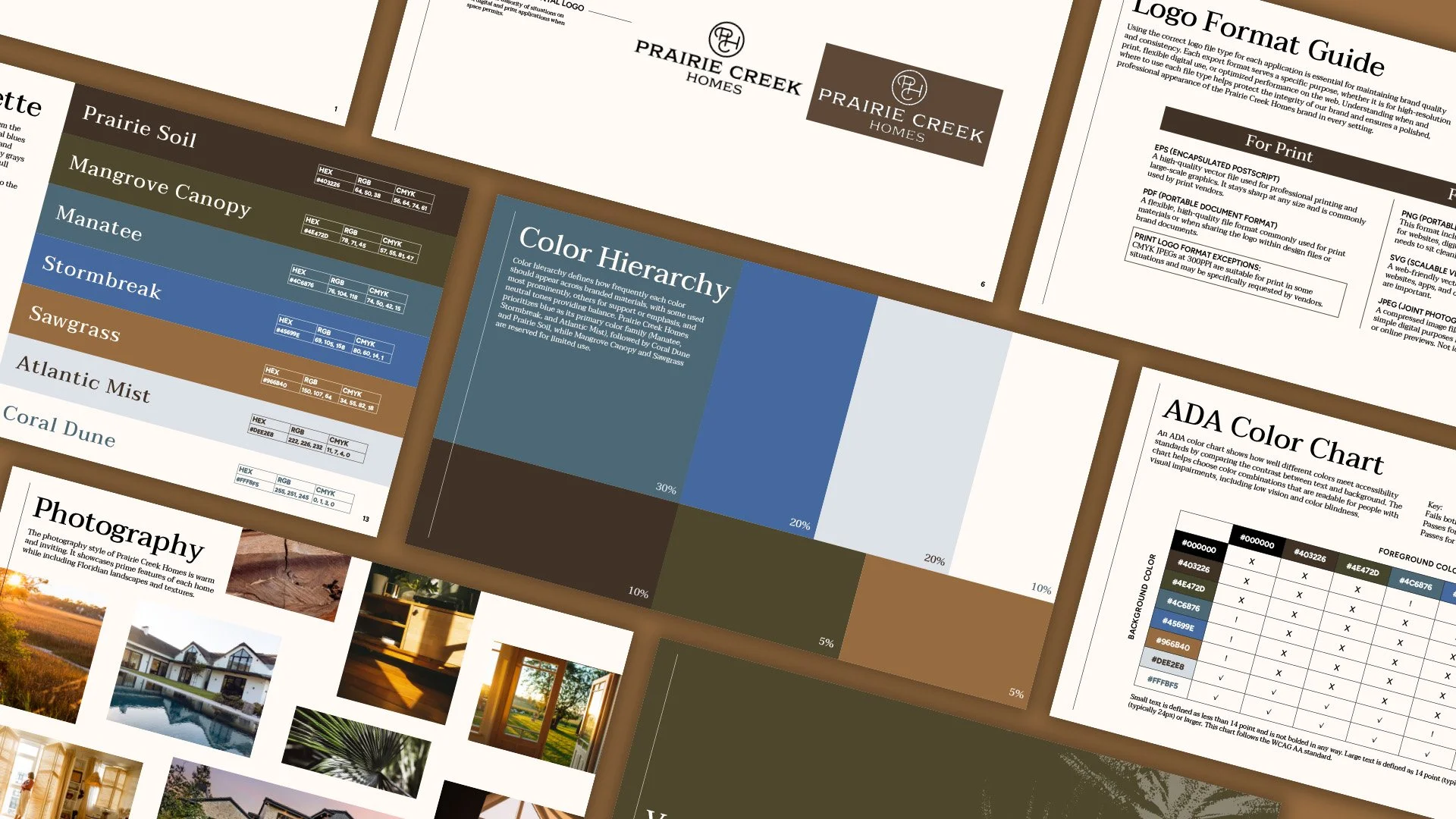 Prairie Creek Homes draws from the true spirit of Old Florida, using a palette inspired by Florida’s natural landscapes and a collection of cohesive elements that reflect native environments, materials, and craftsmanship. Together, these elements round out the brand, creating a grounded, authentic identity rooted in its surroundings.