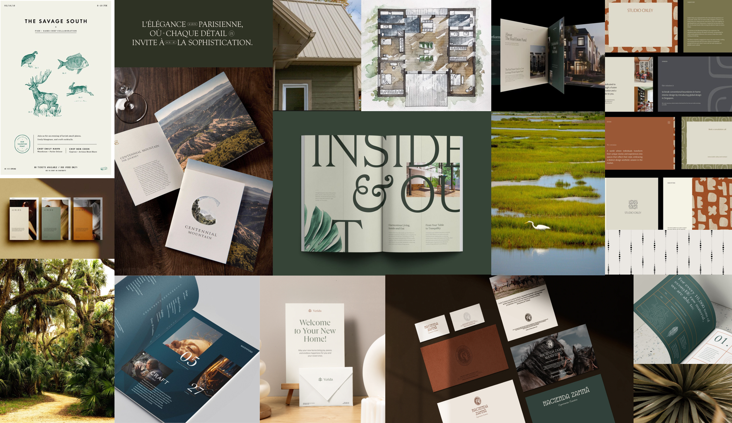The Prairie Creek Homes brand draws inspiration from the look and feel of Old Florida, grounded in natural beauty, enduring craftsmanship, and rustic charm. Shown below are the moodboard and early logo explorations that helped shape and refine the core of the Prairie Creek Homes brand.
