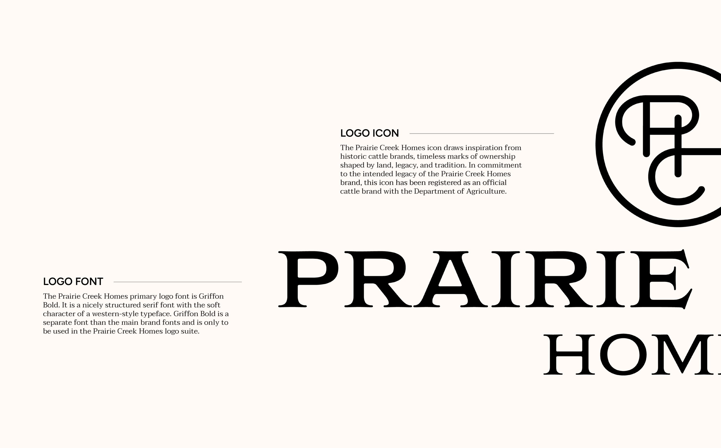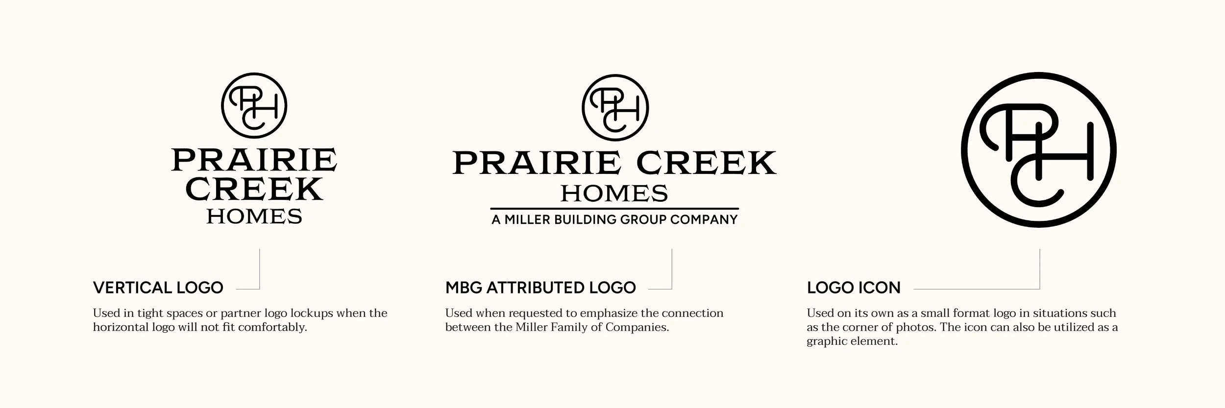 The Prairie Creek Homes logo is a combination mark, featuring a stylized serif logotype paired with a distinctive icon. The mark feels polished and balanced while preserving the character and craftsmanship central to Prairie Creek Homes’ signature style. To support a variety of applications, three additional logo variations were developed to meet the company’s broader branding needs.